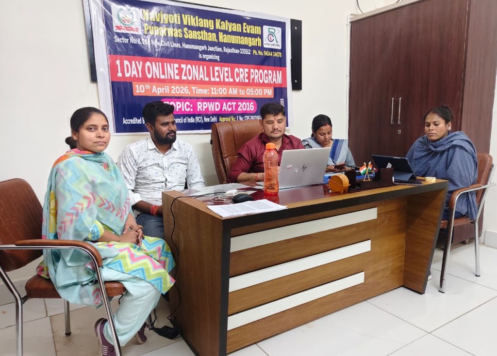 हनुमानगढ़। नवज्योति विकलांग कल्याण एवं पुनर्वास संस्थान के तत्वावधान में आरपीडब्लयुडी अधिनियम 2016 पर आधारित एक दिवसीय ऑनलाइन जोनल सीआरई प्रोग्राम का सफल आयोजन किया गया। इस कार्यक्रम का उद्देश्य दिव्यांगजनों के अधिकारों के प्रति जागरूकता बढ़ाना और पुनर्वास सेवाओं की गुणवत्ता को सुदृढ़ करना रहा।